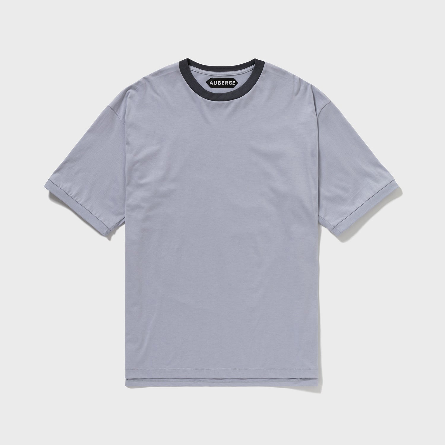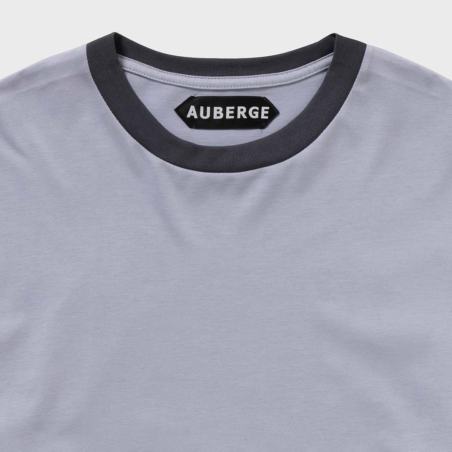 AUBERGEで最もシンプルなクルーTで、かつてJAZZの刺繍モチーフを入れた型を使用。ネックのフライスのみを配色にしたトリム、リンガーデザイン。袖口まで配色するとアメリカ的になりすぎるため、ネックのみの配色としました。