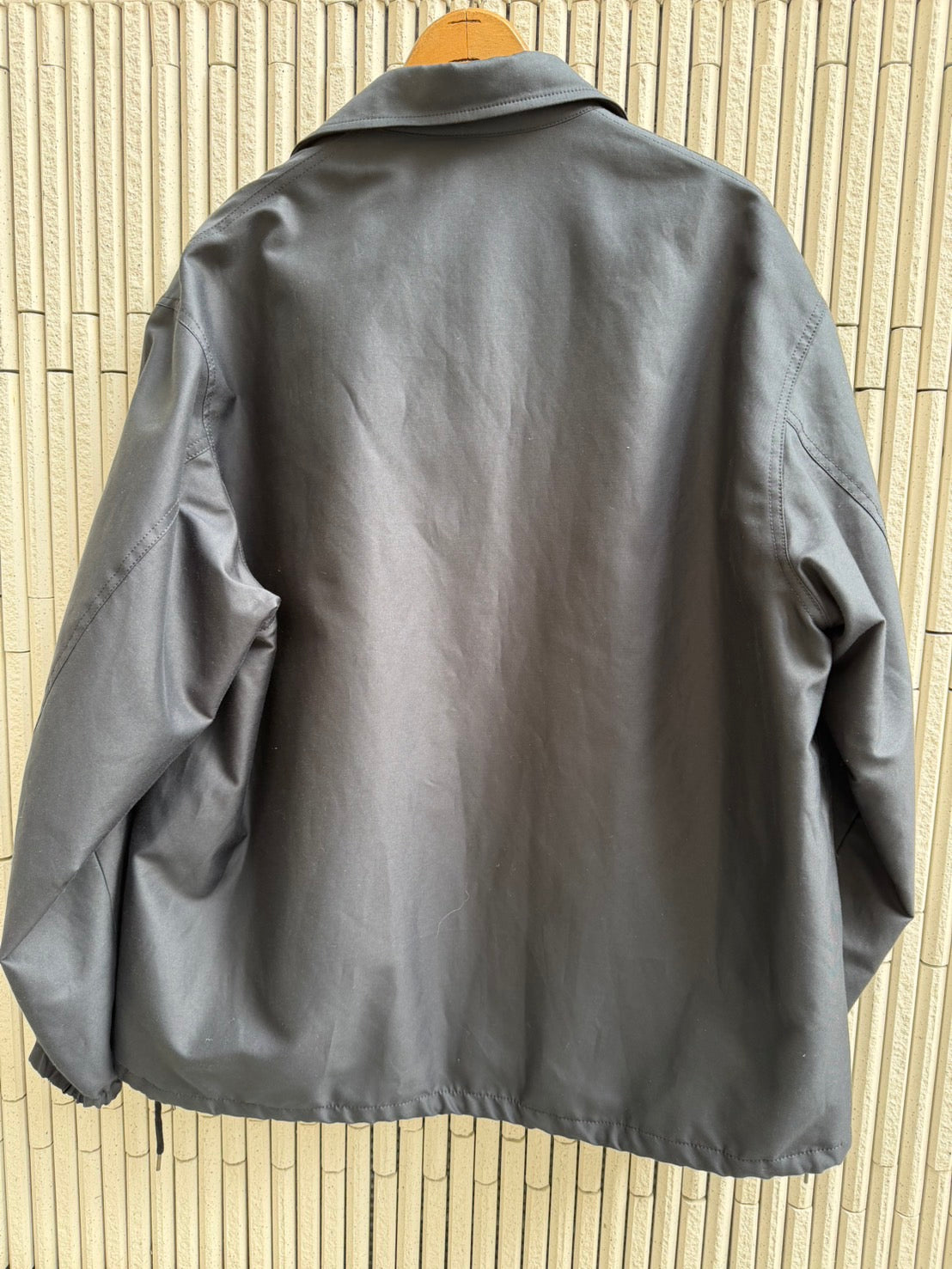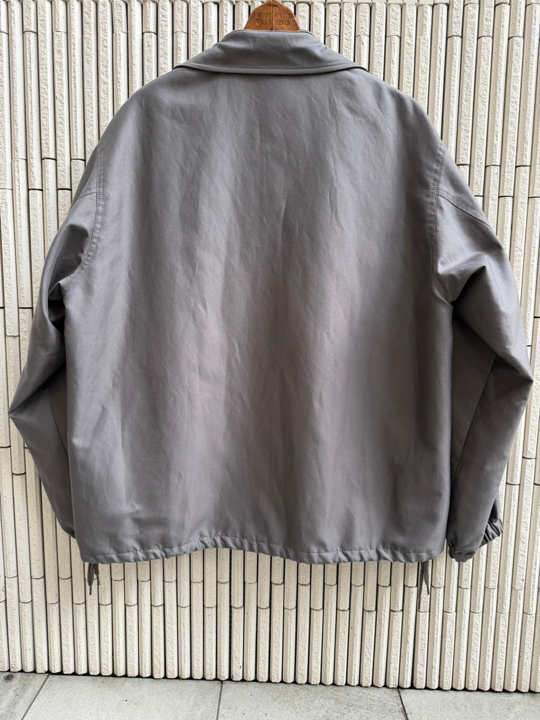 80年代チャンピオンやL.L.BEANなどのコーチジャケットをベースにデザインしました。いわゆるアメリカのコーチジャケット(グランドジャケット)タイプですが、袖を若干太めにして袖口ギャザーでエレガントな雰囲気に。このスクールユニフォームっぽさとシーアイランドコットンとシルクの光沢、袖口にゴムを入れたギャザーによる膨らみはありきたりな1着から1線を画す。身頃裏地にはカシミヤをはって保温性を高めています。