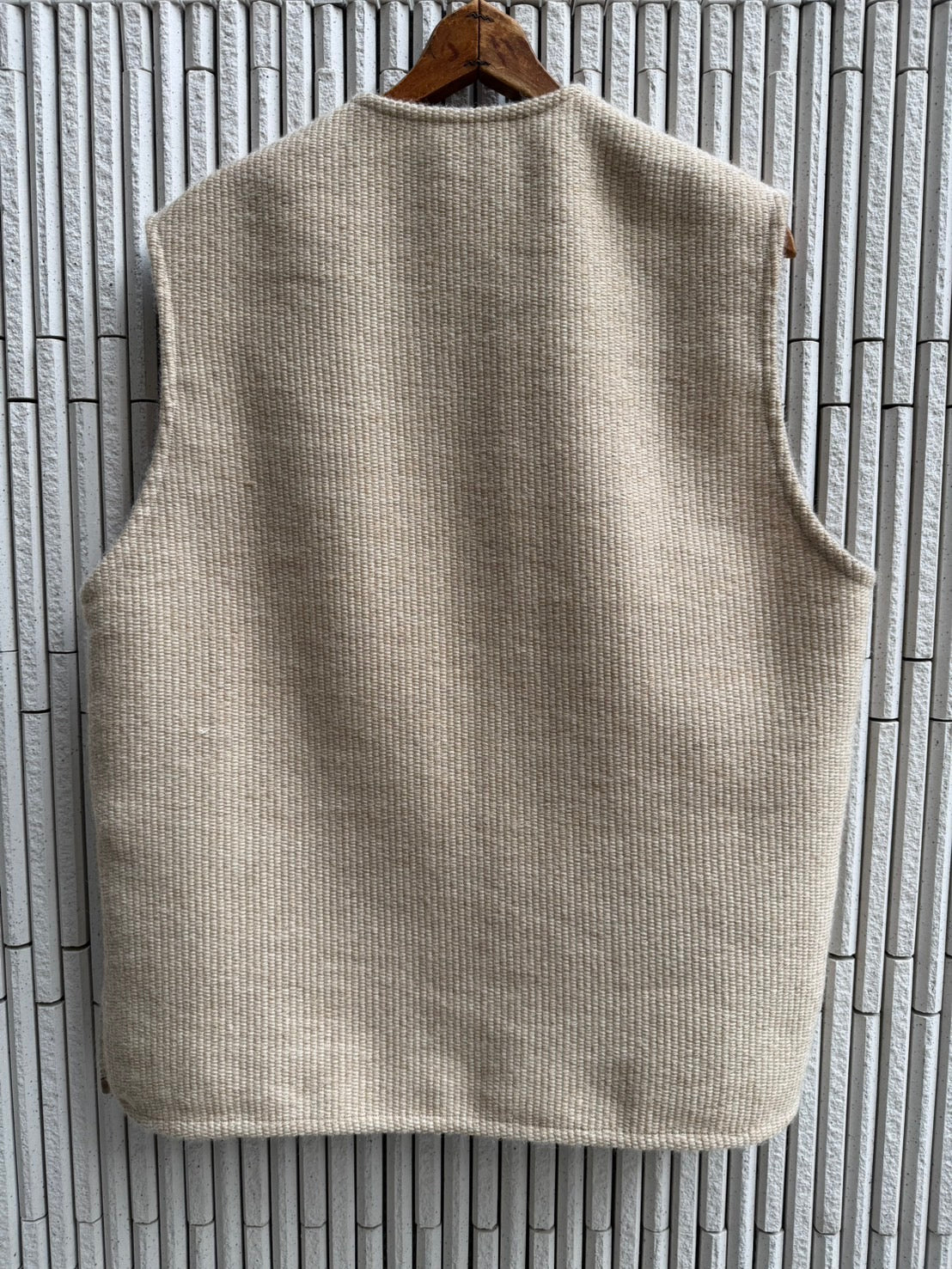 ビンテージのオルテガベストもまた、狭い肩幅、短め着丈とそのまま着ると必ず当時の人的なフィッティングとなってしまう。そこでさまざまなアイテムとのレイヤリングを考え、我々なりの現代版オルテガベストを完成させました。主に肩幅を広めに取り、柔らかく片線に馴染む肩傾斜で仕上げました。アームホールも若干広めにとり、さまざまなレイヤードに対応できるように設計しました。