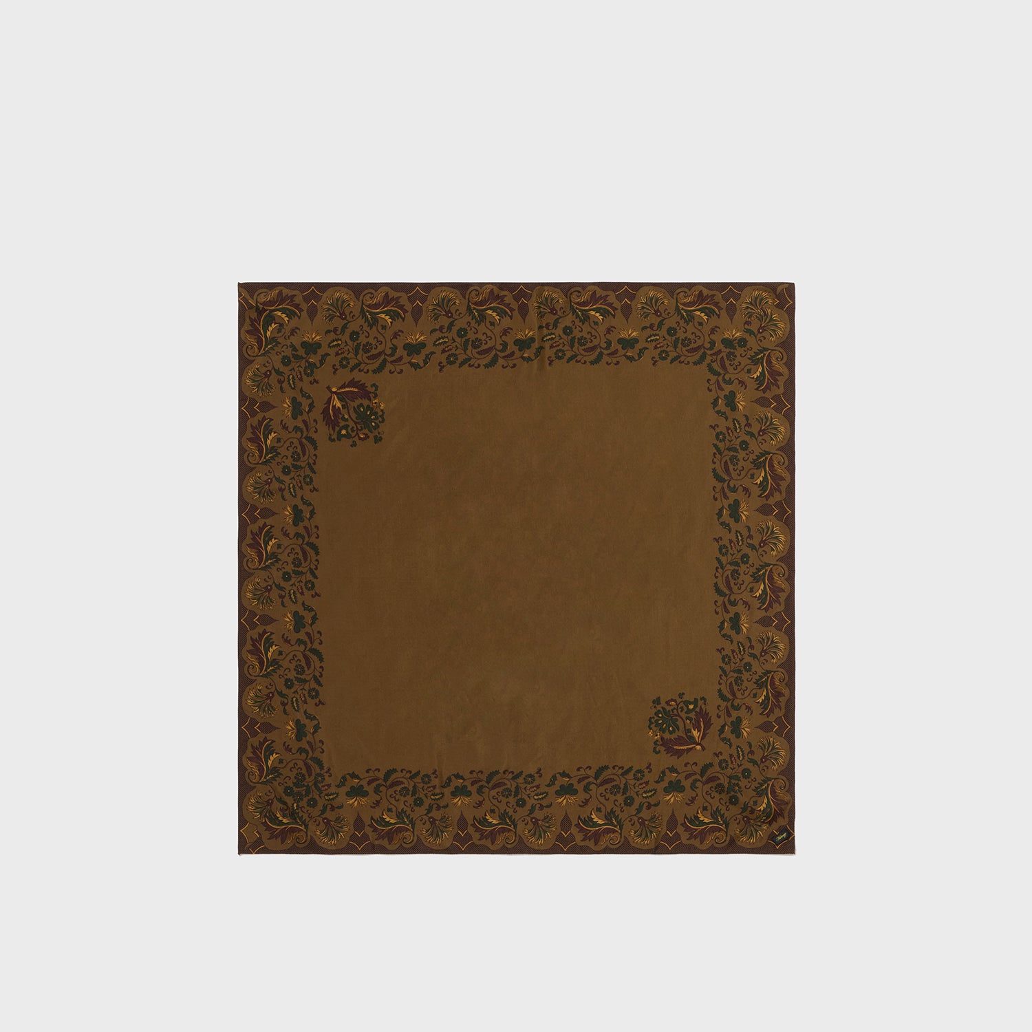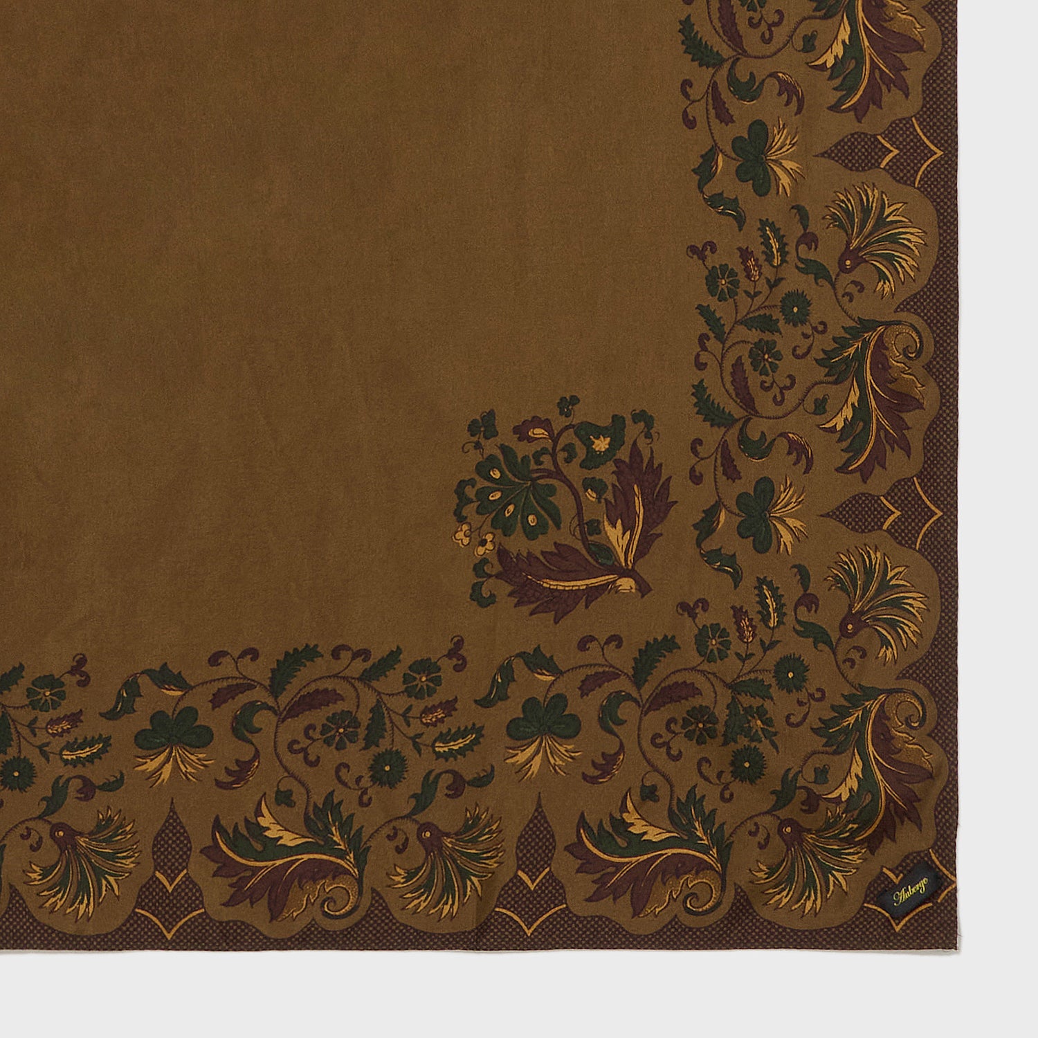 柄はKEVINと共通、北フランスで200年前に作られたFICHUフィシュと呼ばれるスカーフを京都の超絶プリント工場で再現いたしました。モチーフはアザミの花と葉で当時のスタンダード。東インド会社が17世紀インドからヨーロッパへもたらしたペーズリー、小花のようなエキゾチック柄はその後時代を経てアメリカのバンダナへと繋がっていく。その源流のようなフレンチテキスタイルの再現である。