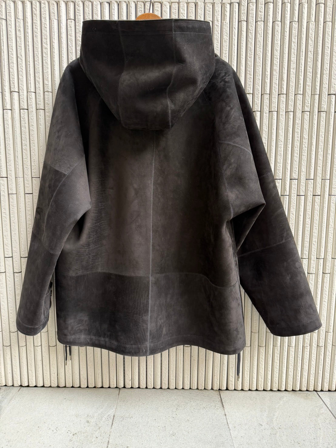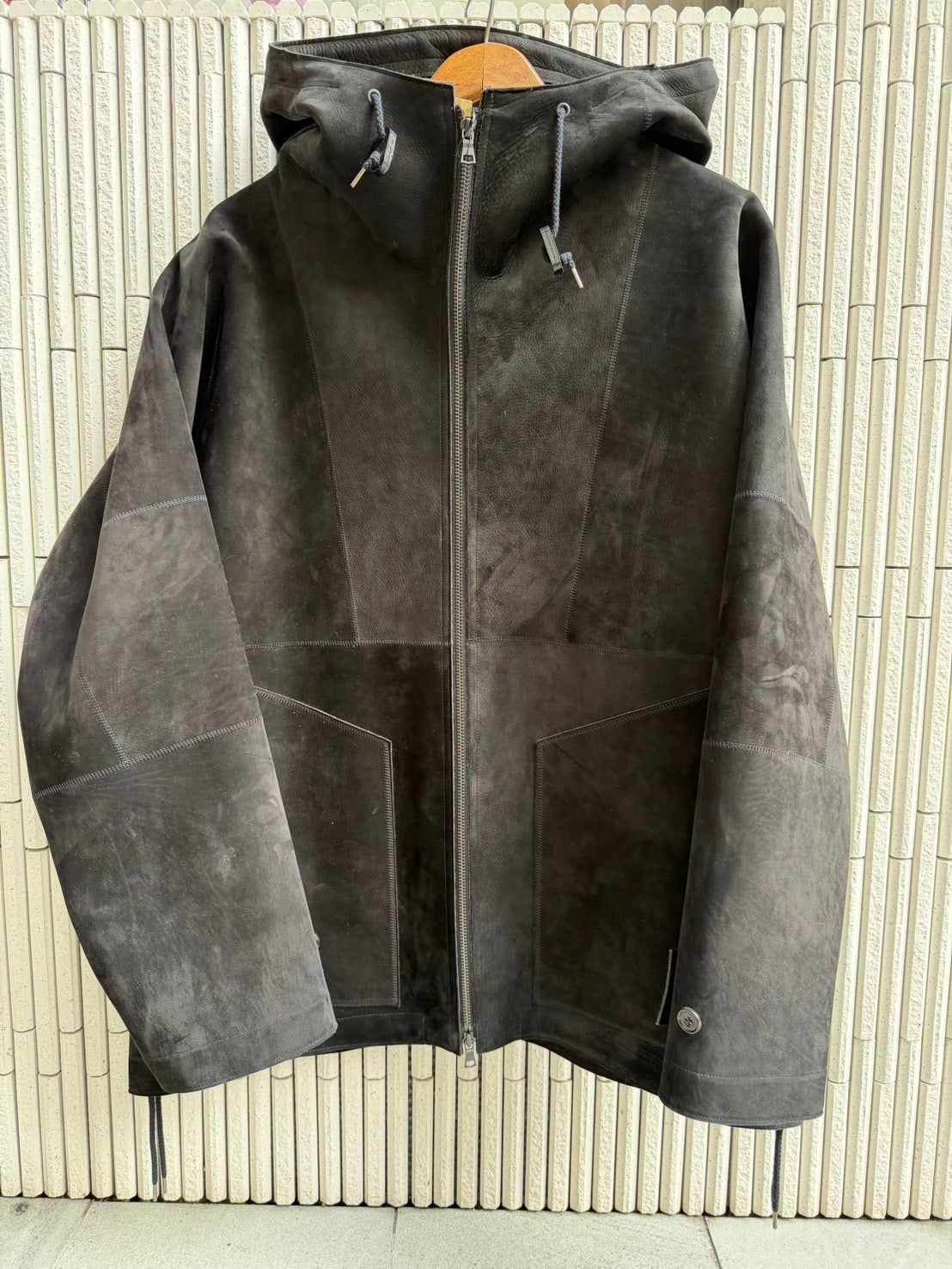 オーセンティックなフーディーヤッケをデザインしました。用尺を必要とするのでレザーでは作りにくい、あえてスポーティーなデザインにしました。ハリがあるのでフード周りがくったりせずしっかり狙ったシルエットになります。ヌバックは経年変化も出やすいので敢えてガンガン着ていただき、ややくったりした頃が最高のラグジュアリーな風合いに育ちます。